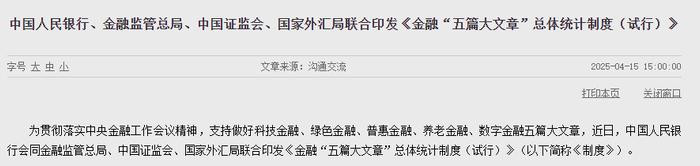 近日,中国东谈主民银行(简称“央行”)会同金融监管总局、中国证监会、国度外汇局勾通印发《金融“五篇大著述”总体统计轨制(试行)》(下称《轨制》),要点对金融“五篇大著述”范畴的统计对象及边界、统计狡计及口径、统计认定法度、数据相聚、分享及发布、部门单干等作出融合规定。