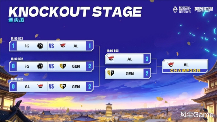 AL、GEN、IG三支战队,近日受邀参预濮院电竞节,三队以大乱斗的比赛模式,张开较量角逐冠军,首轮顽抗,IG和AL王人被GEN,以2:0的比分零封,AL和IG则是打成1-1,靠着时悼念的上风,AL进到了决赛跟GEN打BO5,两队苦战五局,最终AL以3:2的比分,打败GEN拿下电竞节冠军。