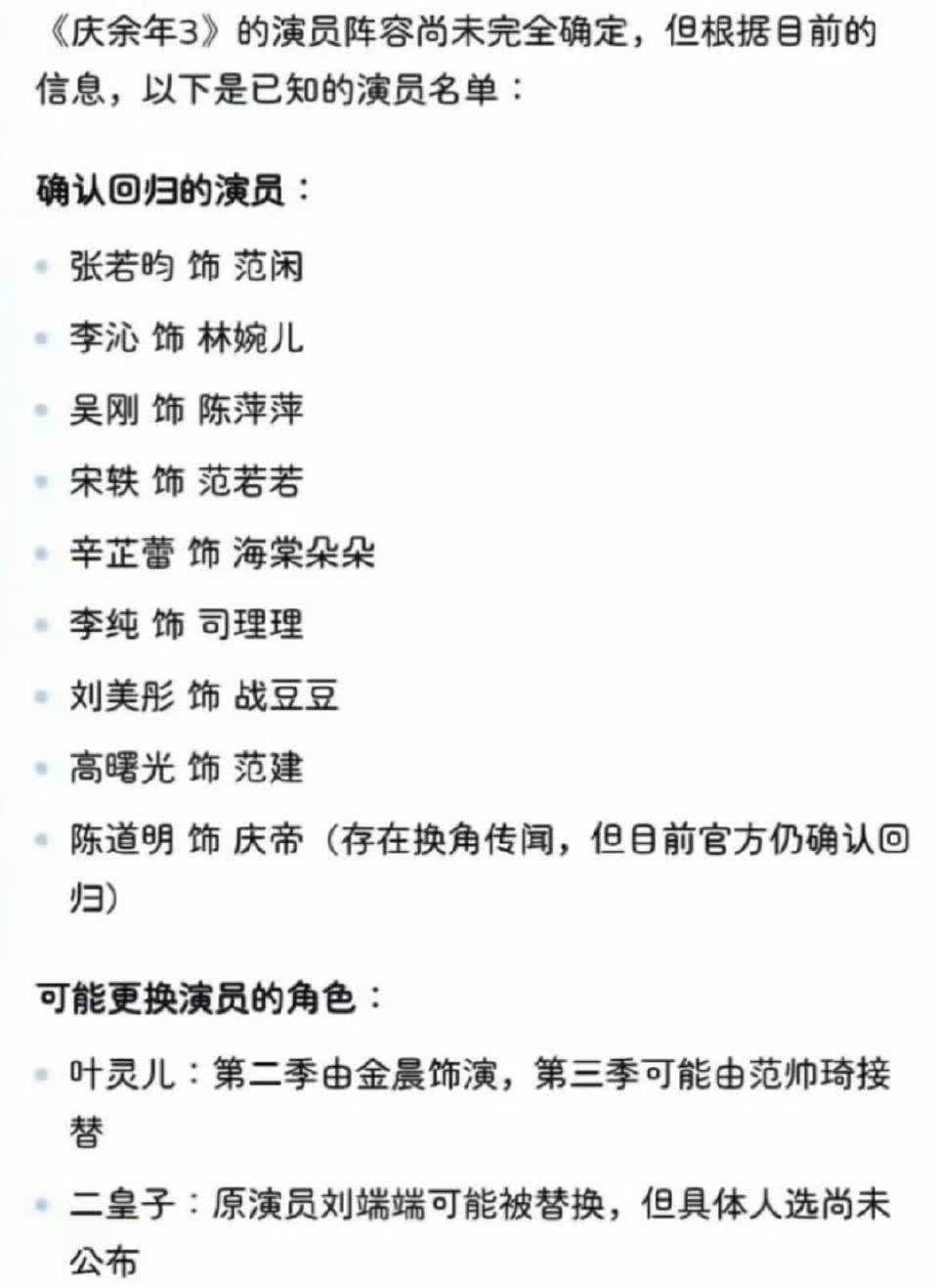 而关连《庆余年3》的演员威望近日在收集上疯传,激发了全网热心。据悉第三季中枢演员险些一王人保留,张若昀、文书念明、吴刚、田雨、宋轶等总计追念。