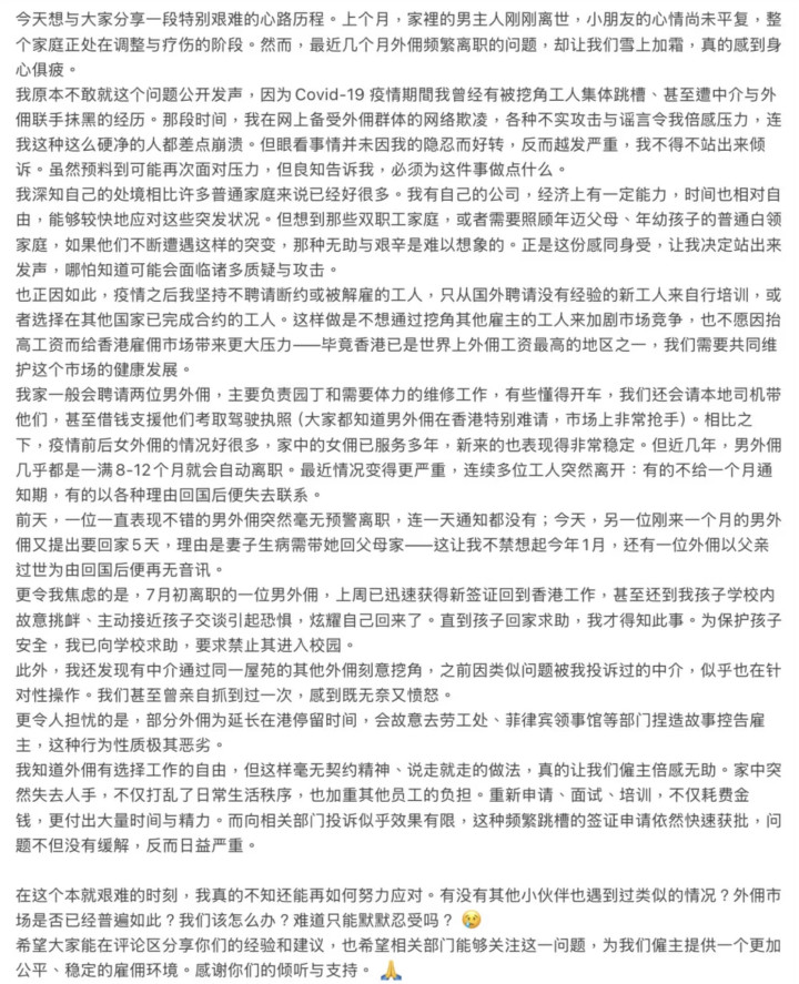 蔡一凤就家佣不竭下野一事,写下了一篇很长的笔墨去抒发我方的心情以及感受。她称家中的男主东谈主盛品儒在8月才离世,一家东谈主的心情皆未平复,效用家佣的常常下野又令她愁上加愁。蔡一凤称从7月驱动家中就有男佣东谈主下野了,没料想这个情况一直抓续了下去。在盛品儒离世之后,外佣又驱动不竭下野,几日前一个阐扬一直可以的男家佣已而毫无预警地就下野了,连一天的示知的时辰皆没给。紧接着才来了一个月的外佣又冷漠要回家5天,原理是夫人生病要带夫人回家——一般情况下以这种步地请假的,皆是有去无回。
