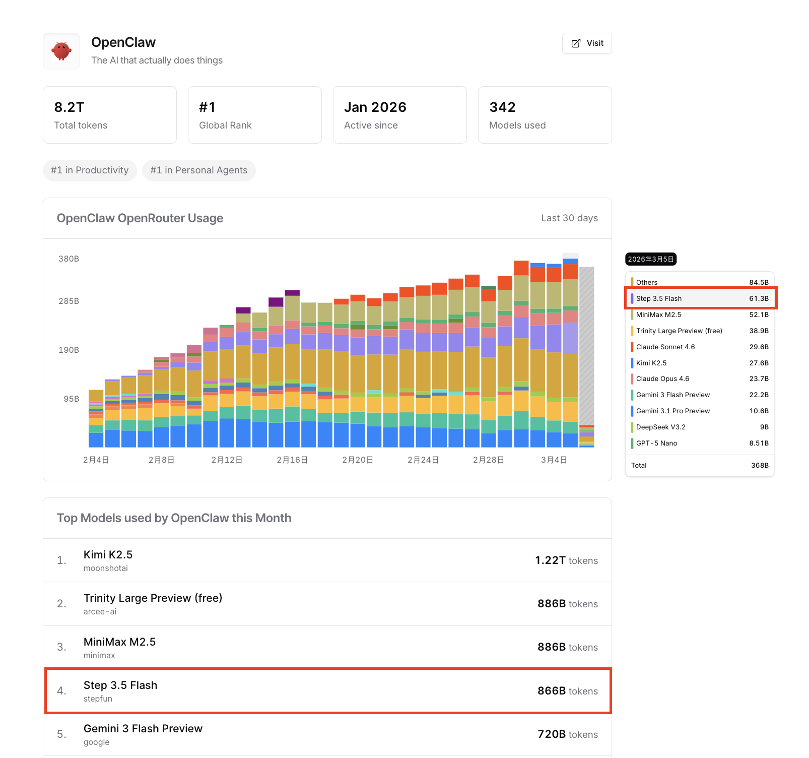 网科技讯 3月6日,近日,阶跃星辰全面开源新一代基座模子Step 3.5 Flash。截止3月6日,该模子在OpenClaw(被网友称为“小龙虾”的人人闻名开源表情)平台上的调用量贯穿两日位居人人第一。
